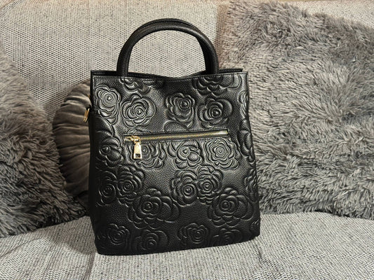 Black Embossed Leather Handbag | Floral Pattern Tote with Gold Details | Elegant Structured Purse