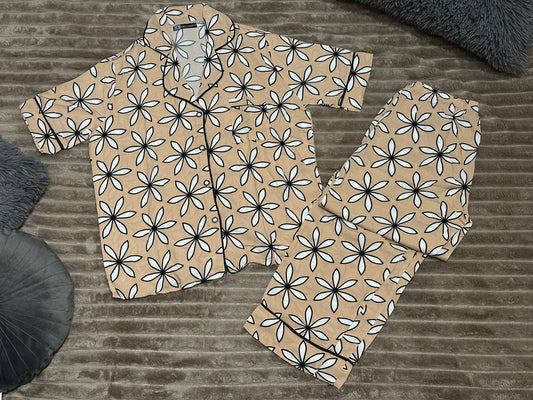 Beige Floral Women’s Pajama Set • Short Sleeve Button-Up Shirt & Long Pants • Lightweight Sleepwear