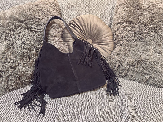 Blue suede handbag with leather details & fringe + pouch | Medium-size women’s bag