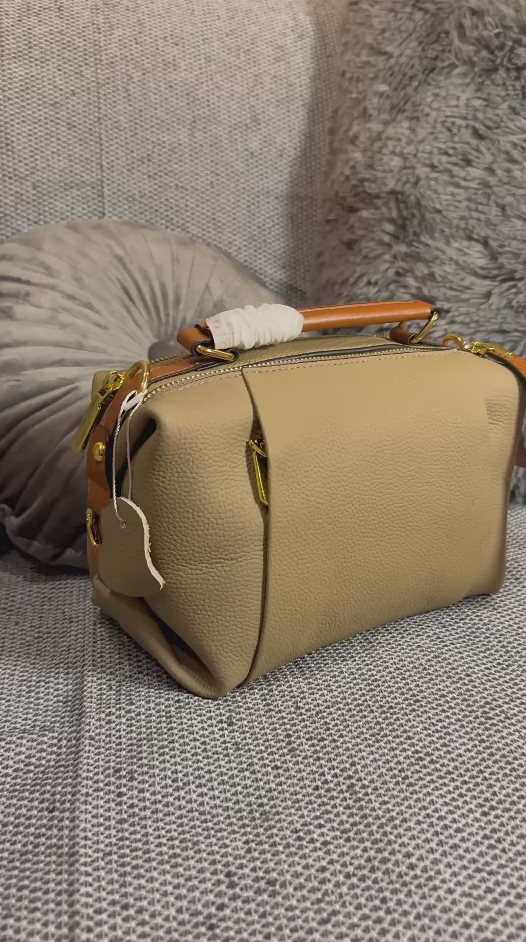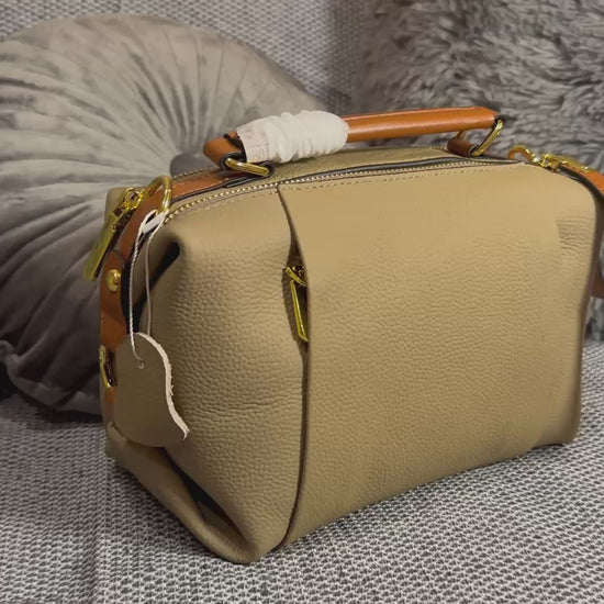 Beige Genuine Leather Handbag | Structured Box Bag with Adjustable Strap | Minimalist Everyday Purse