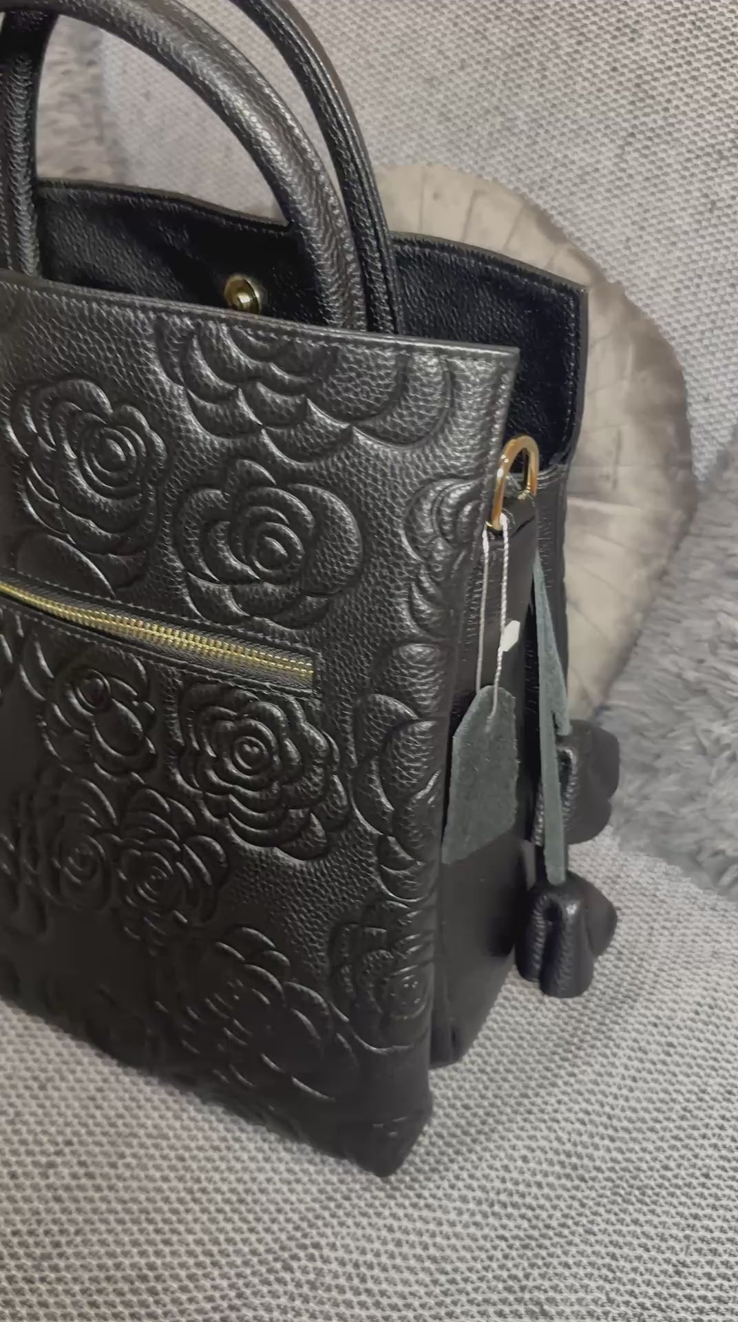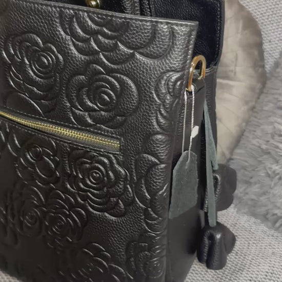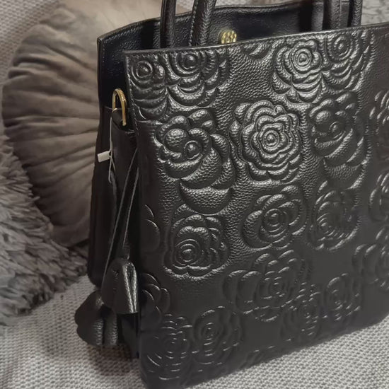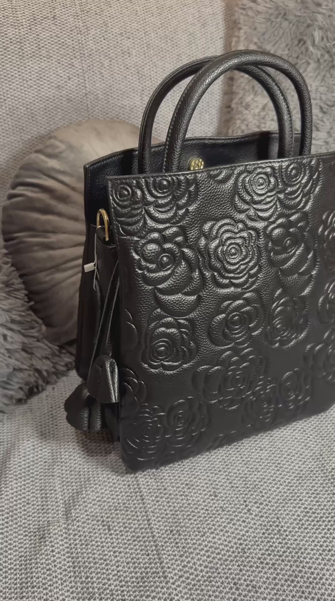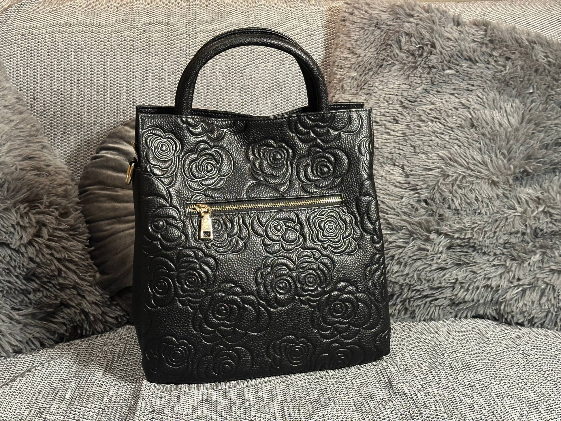 This stunning black leather handbag features a beautifully embossed floral pattern that adds a touch of romance and sophistication.