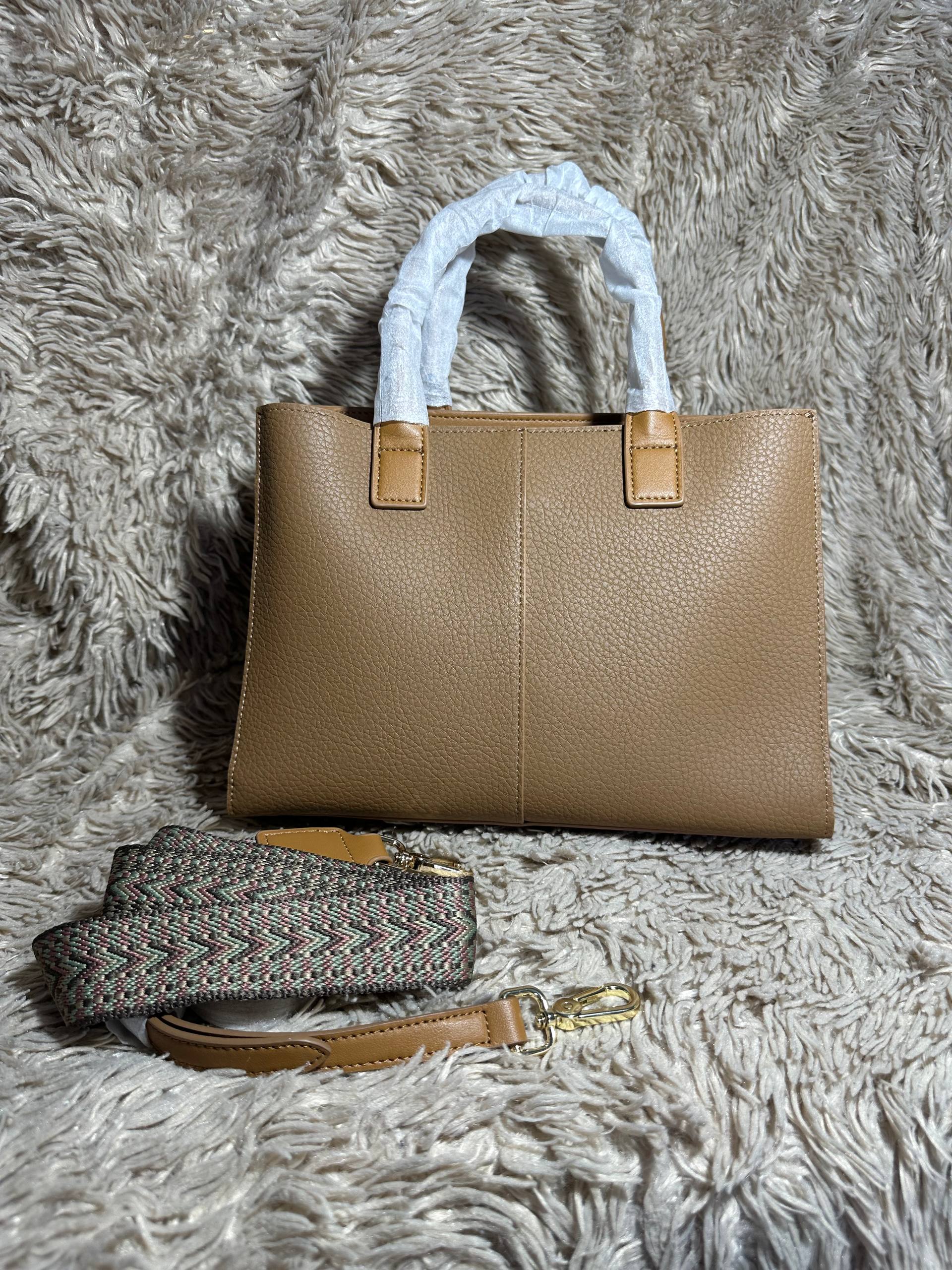 Camel Leather Tote Bag with Straps & Scarf | Genuine Leather Handbag | Structured Shoulder Bag for Women