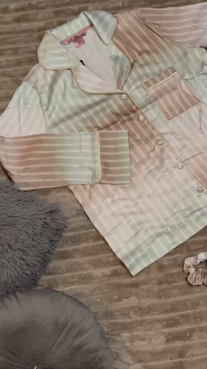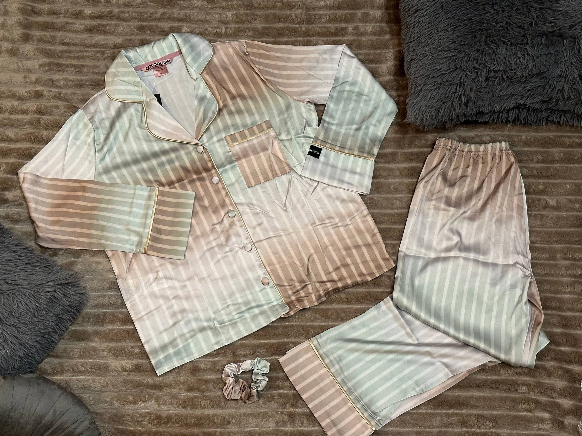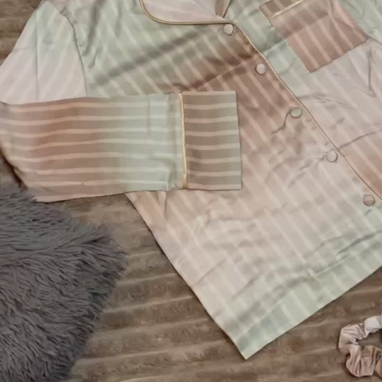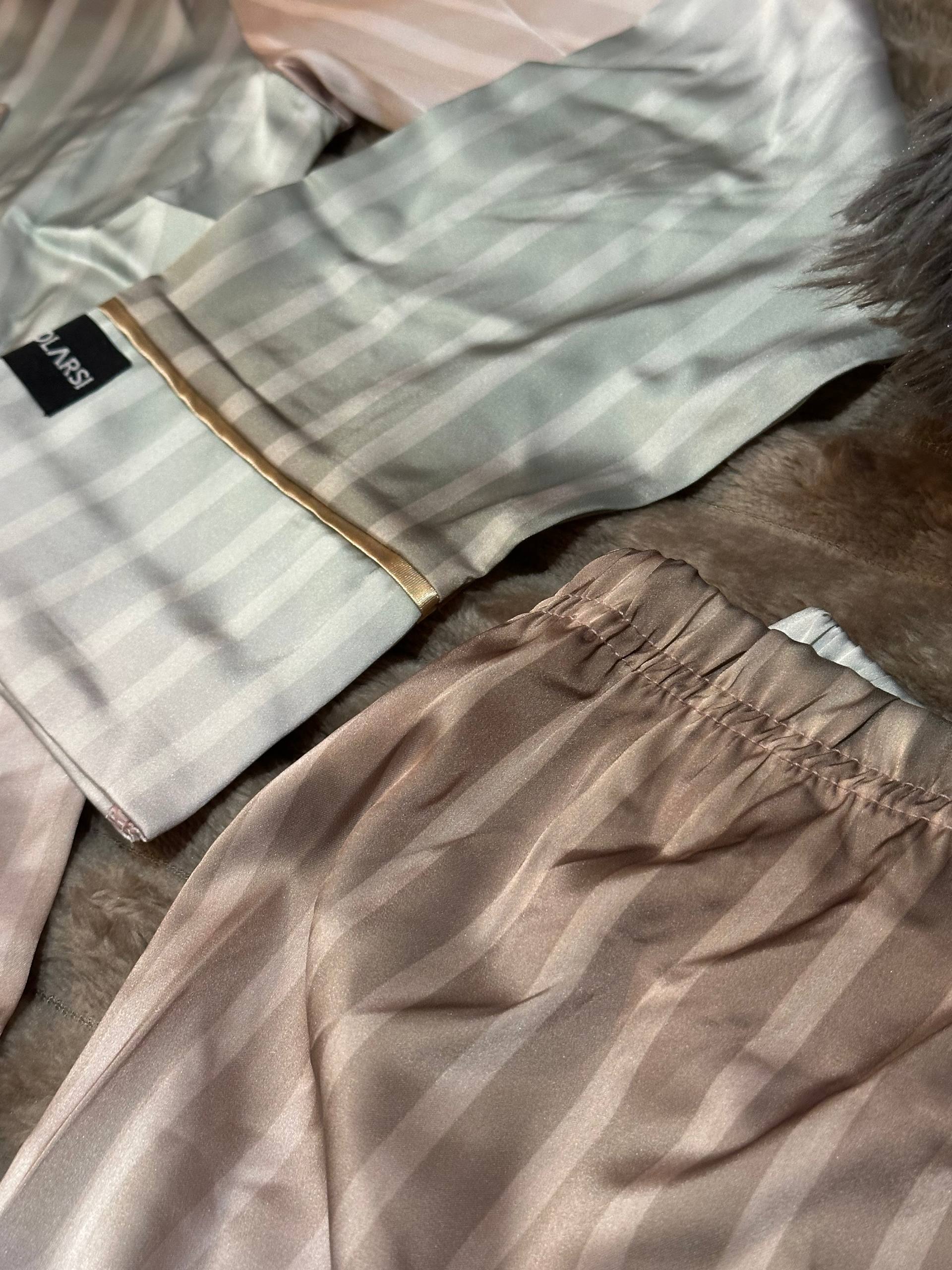 Soft pastel tones blend seamlessly in this elegant pajama set. The subtle vertical stripes create a flattering silhouette, while the golden trim adds a touch of luxury.