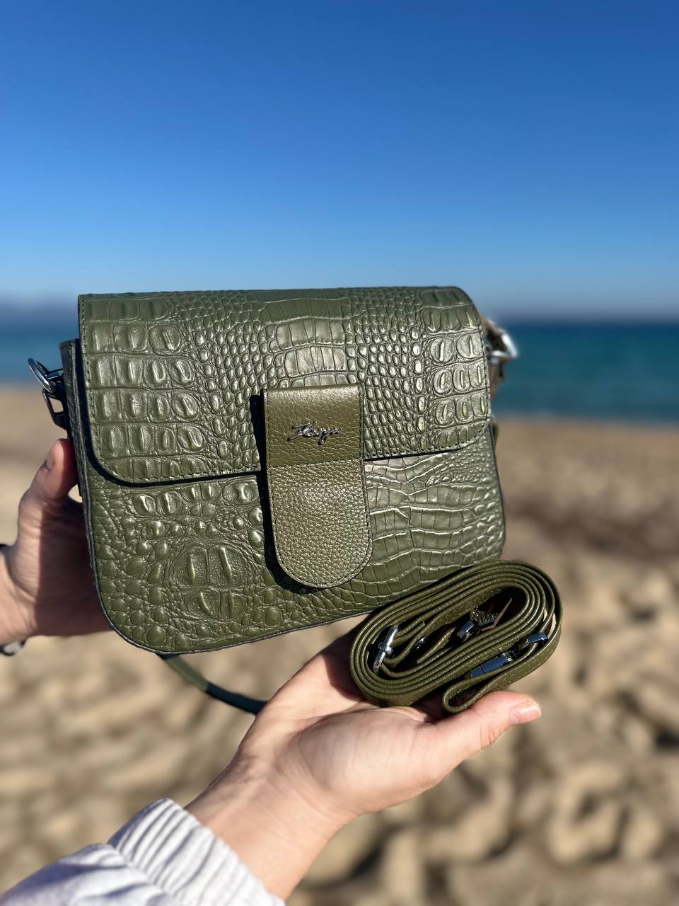 • Design: A rich green color with a crocodile texture and metal hardware adds a touch of luxury.