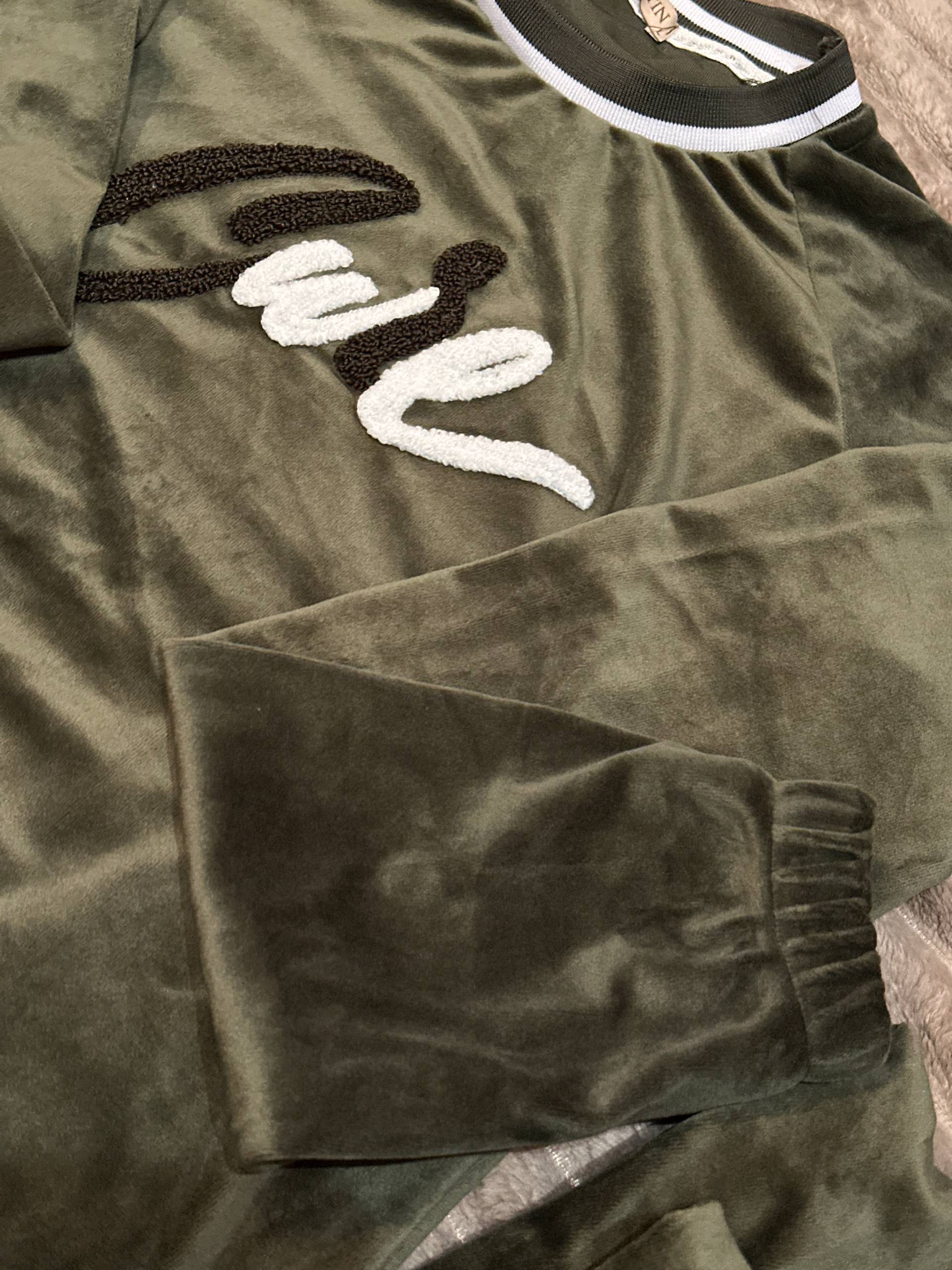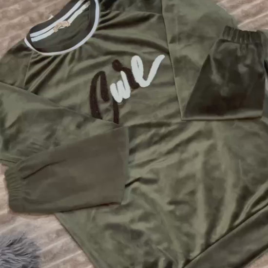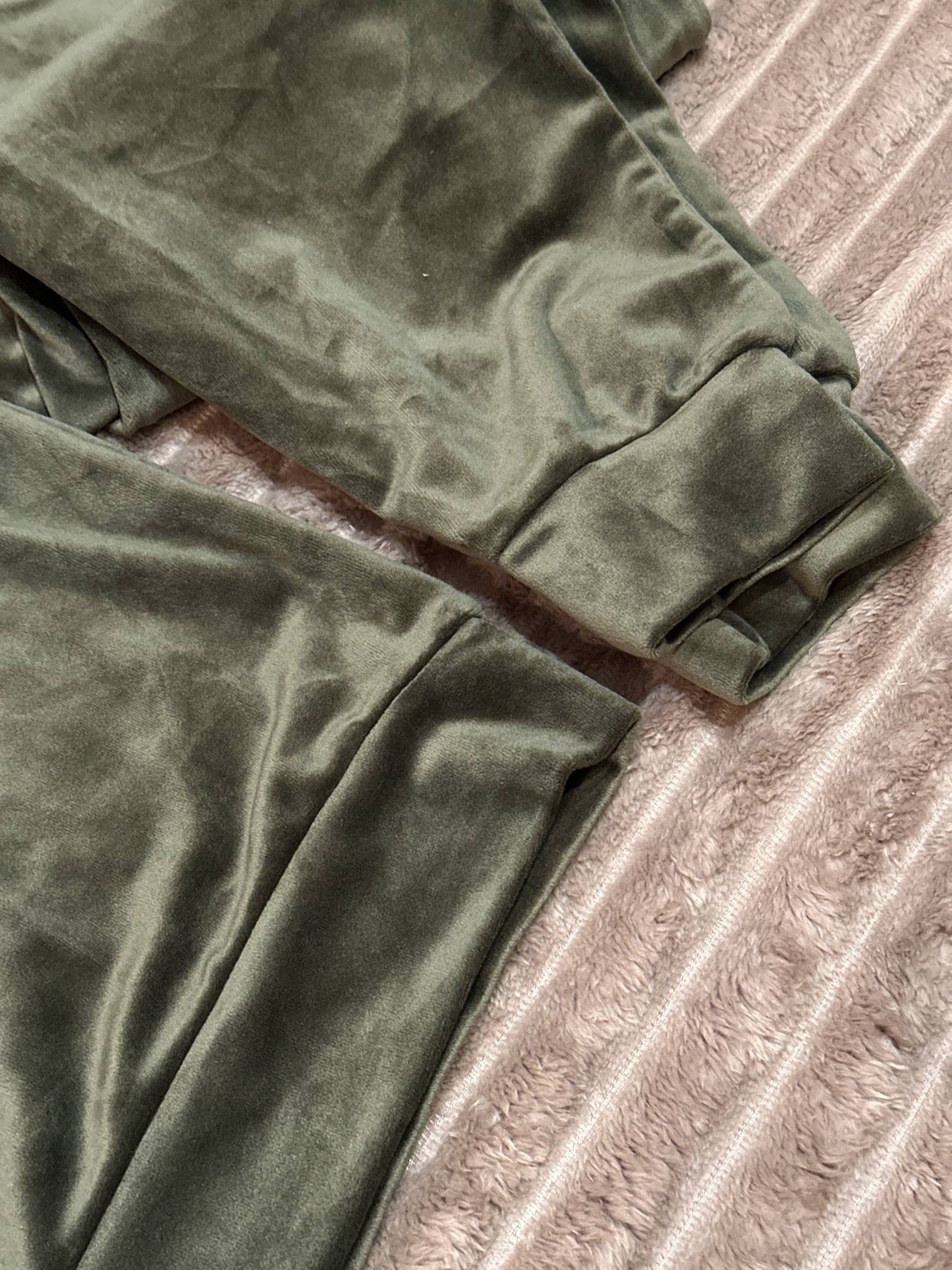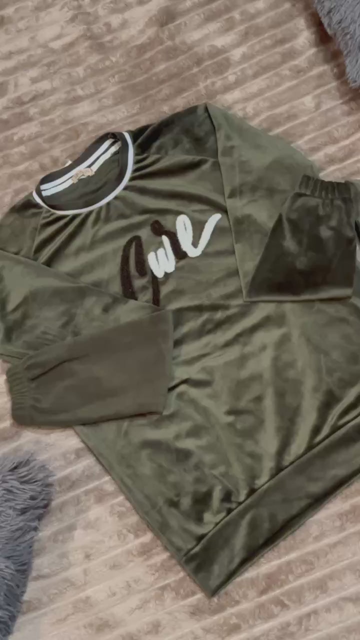 Soft and cozy velour pajama set in trendy khaki color. The set includes a sweatshirt with a 3D “Cute” embroidery and matching pants with elastic waistband and ankle cuffs. The velour fabric is smooth, stretchy, and keeps its shape — perfect for home, lounging, and comfortable sleep.