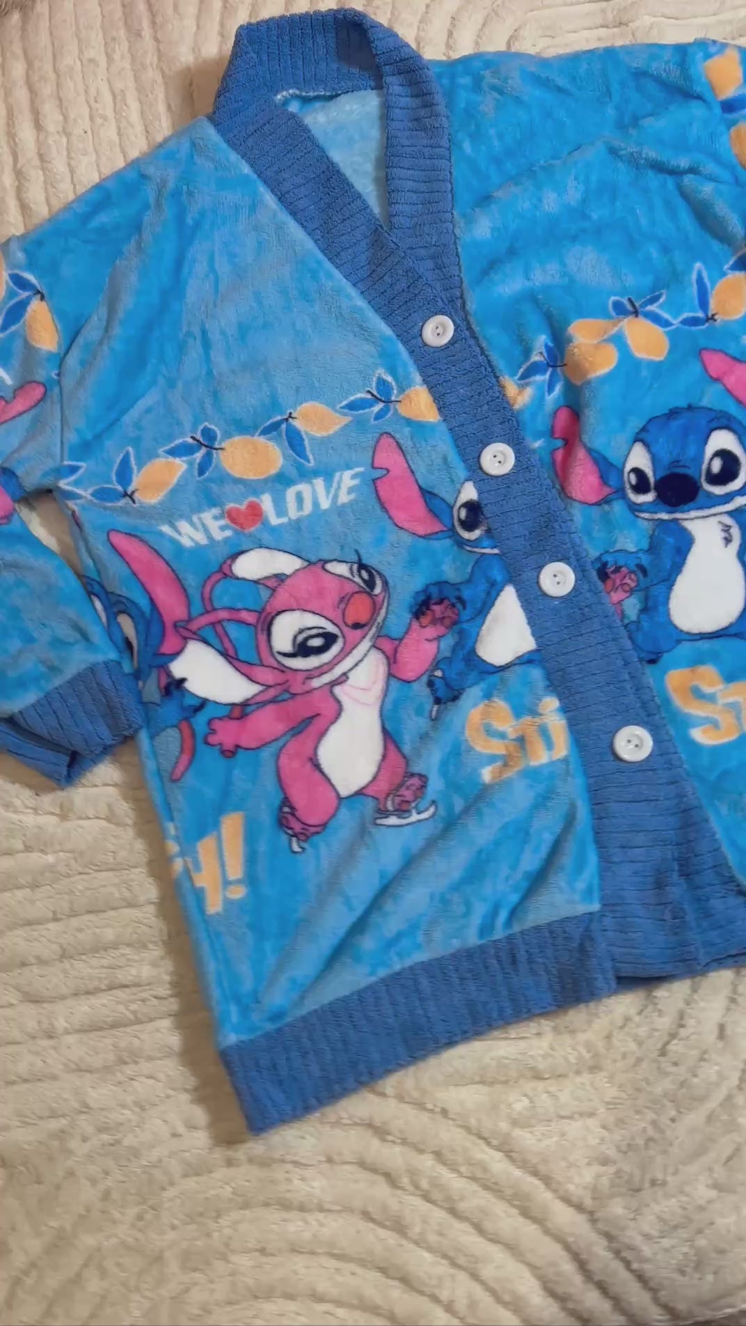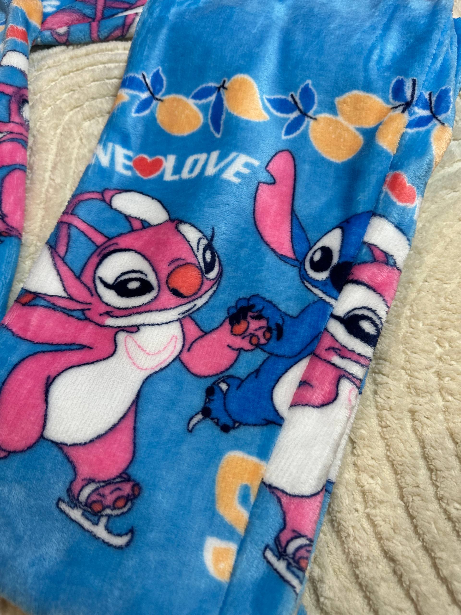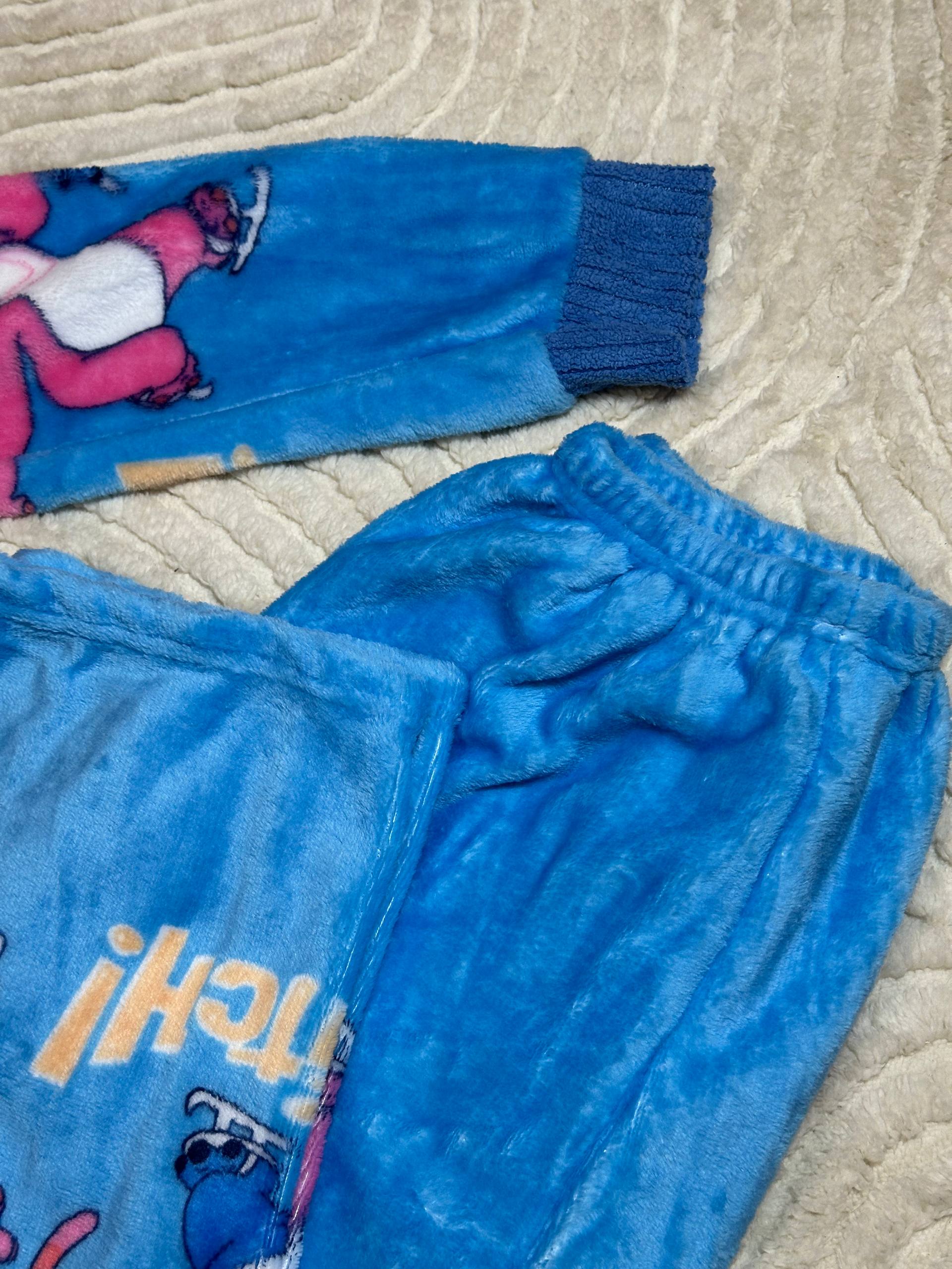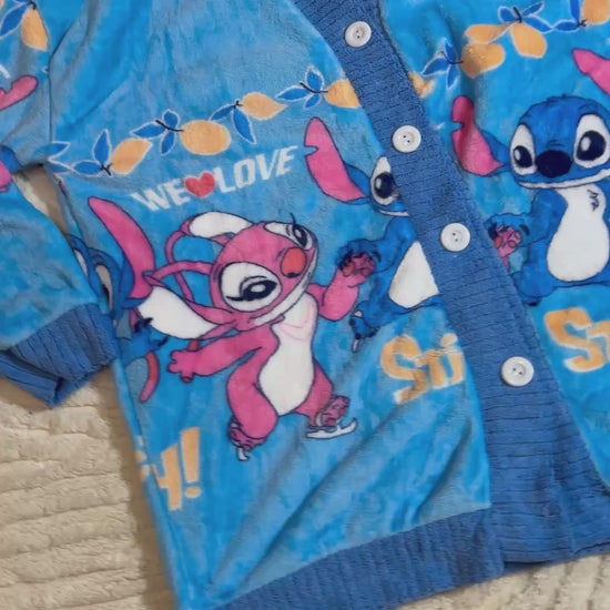 Warm Fleece Pajama Set ⢠Blue Button-Up Cardigan and Pants with Cute Stitch Print ⢠Cozy Winter Homewear
