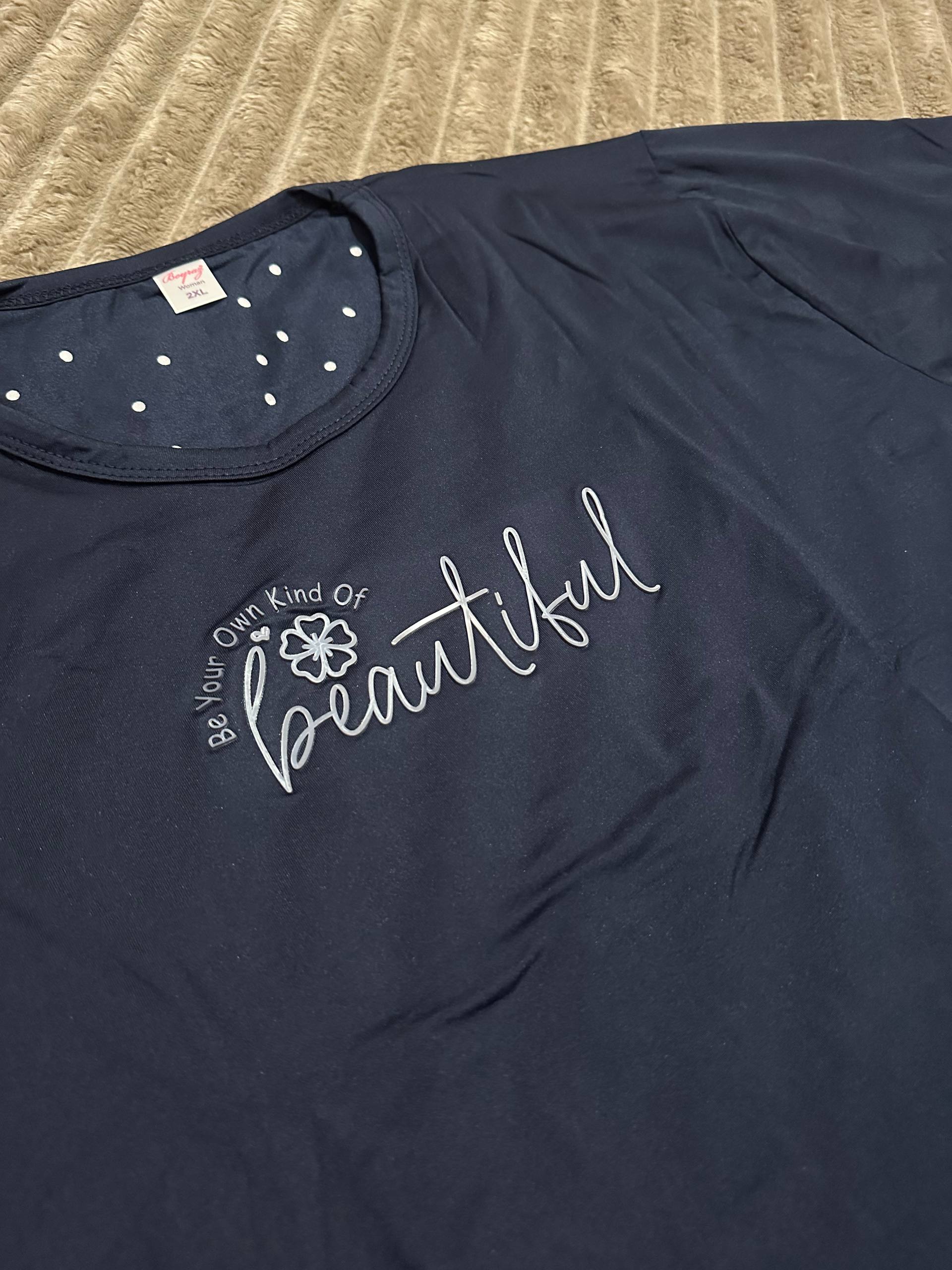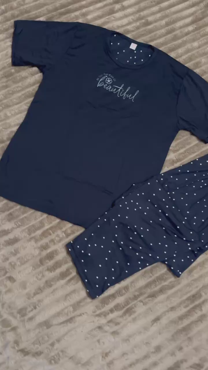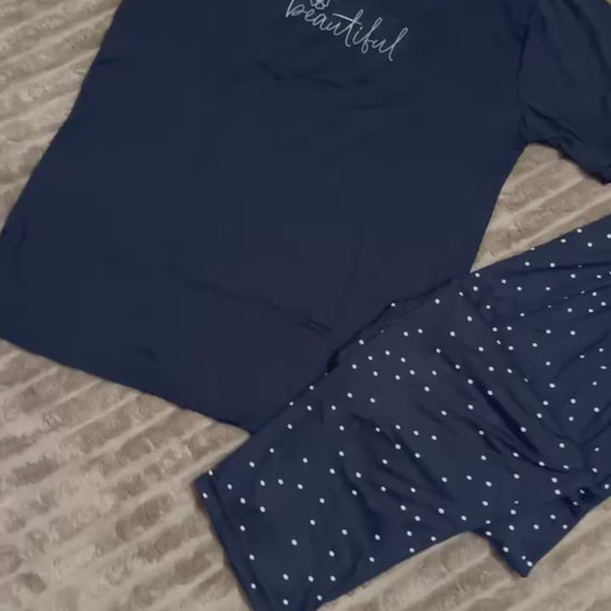 Includes a navy T-shirt with a “Be Your Own Kind Of Beautiful” print and matching polka-dot pants with a comfortable elastic waistband.