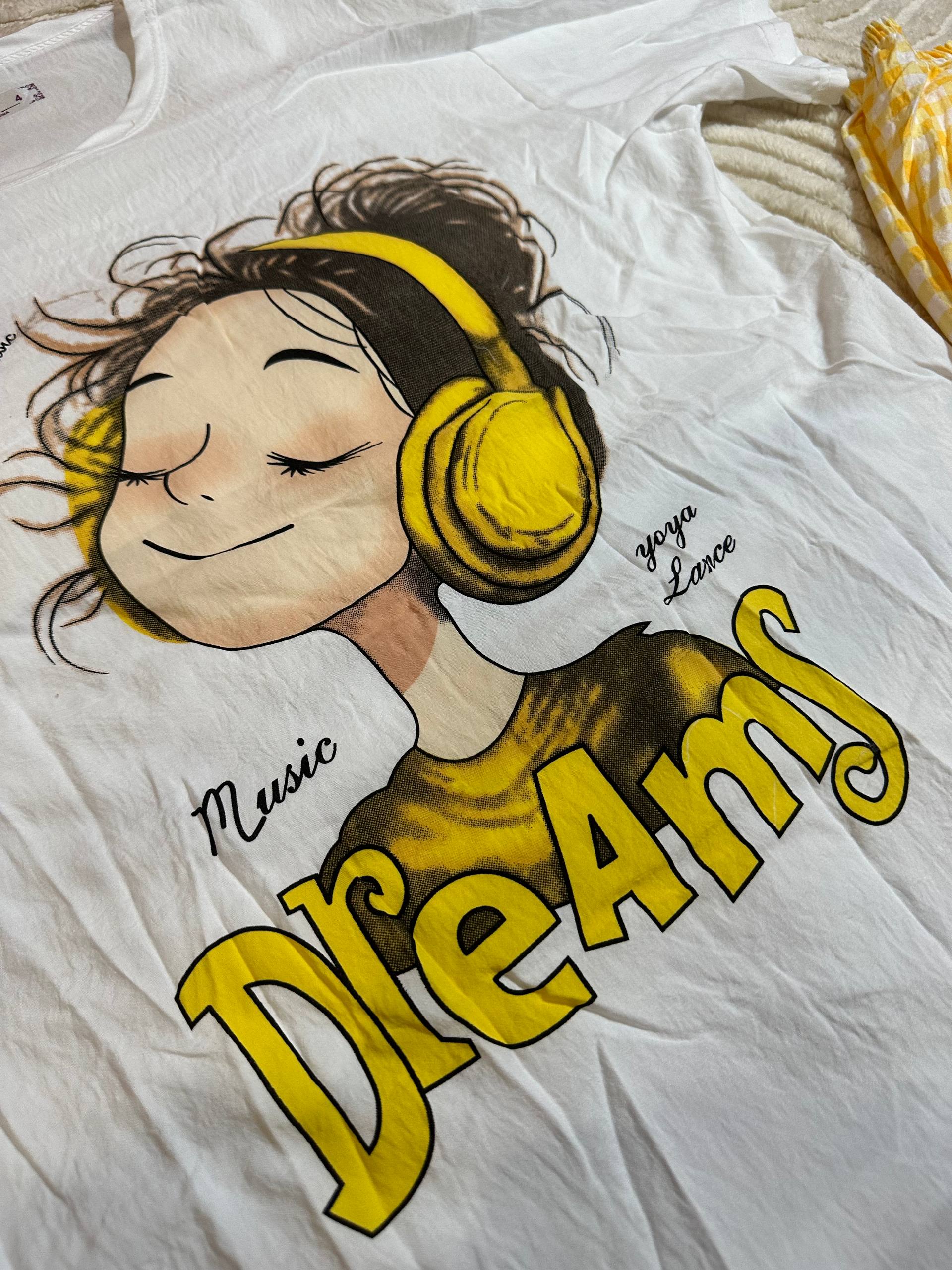 Bring fun and comfort to your bedtime with this adorable pajama set! The two-piece set includes a white short-sleeve T-shirt with a cheerful girl-in-headphones print and matching yellow checkered pants.