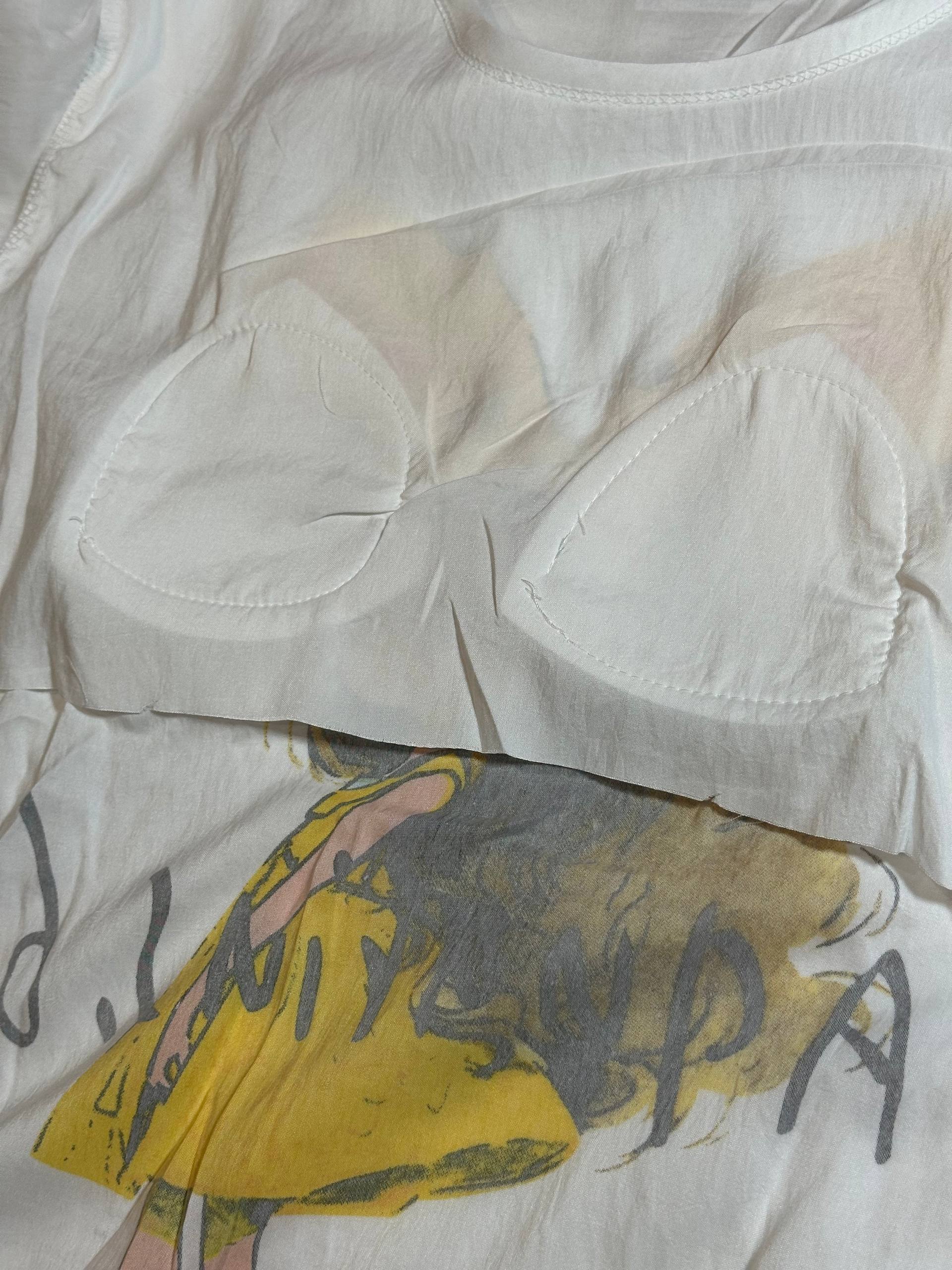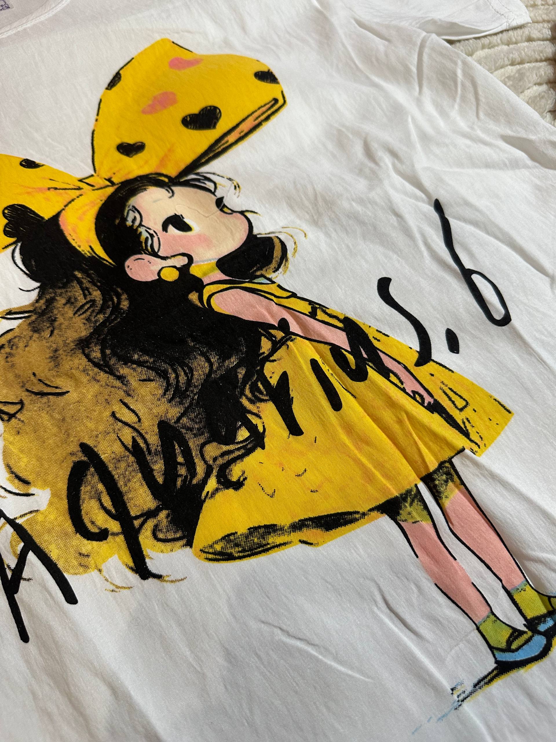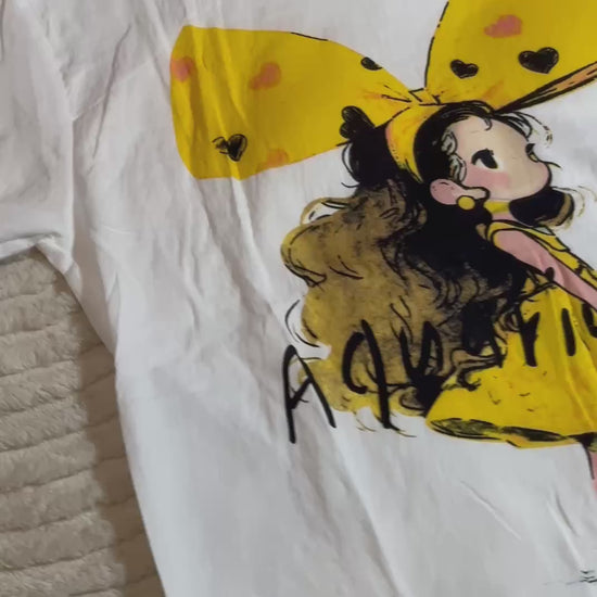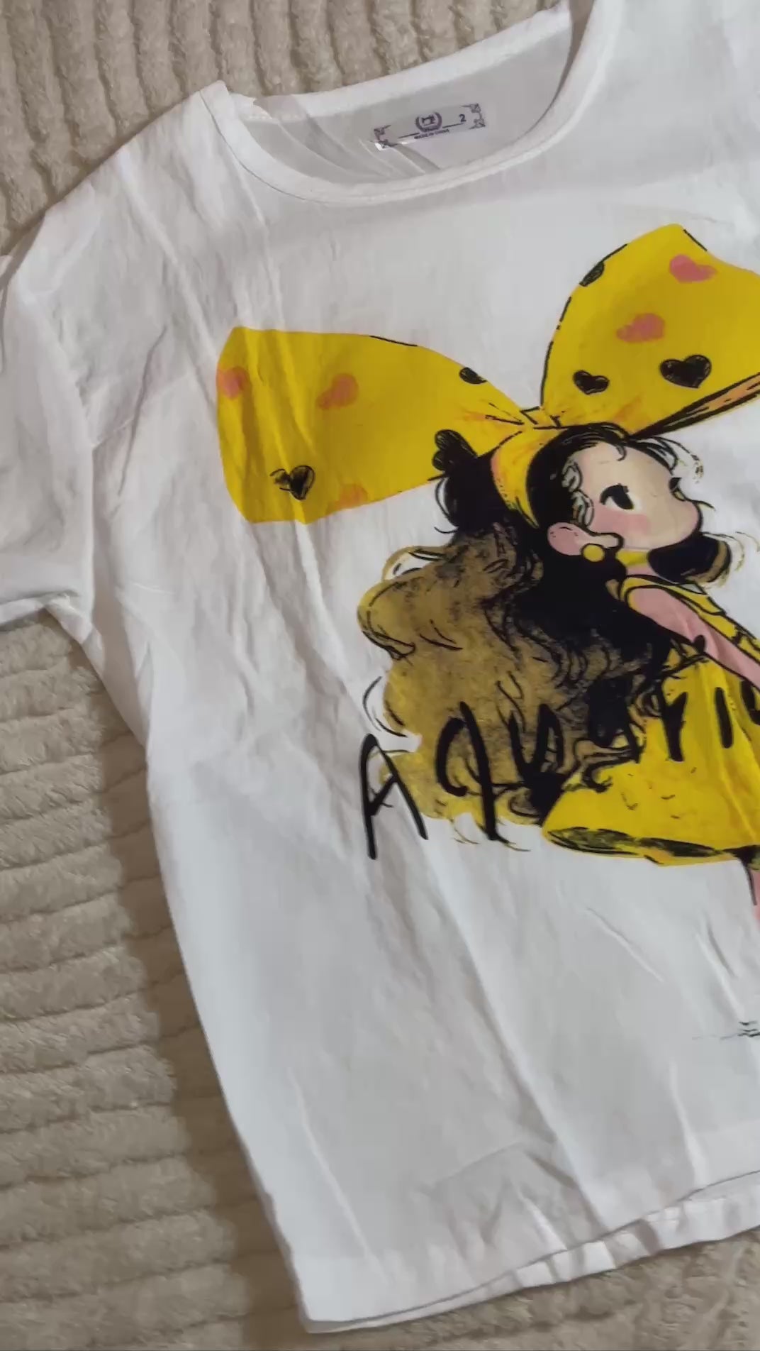 Bright, cheerful, and comfortable — this pajama set is made to bring joy to your evenings! The set includes a white short-sleeve T-shirt with a cute girl in a yellow dress and bow print, and colorful floral pants with a soft elastic waistband.