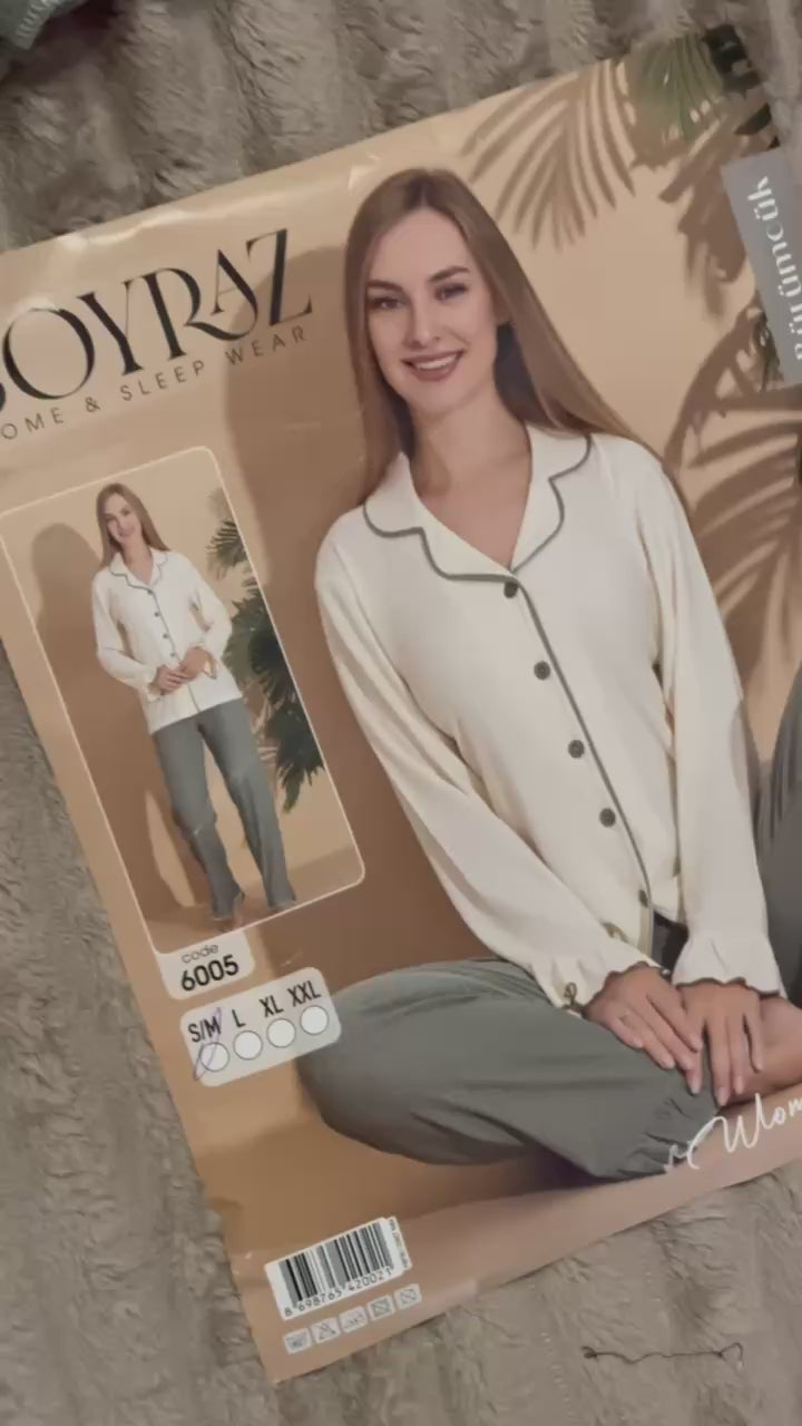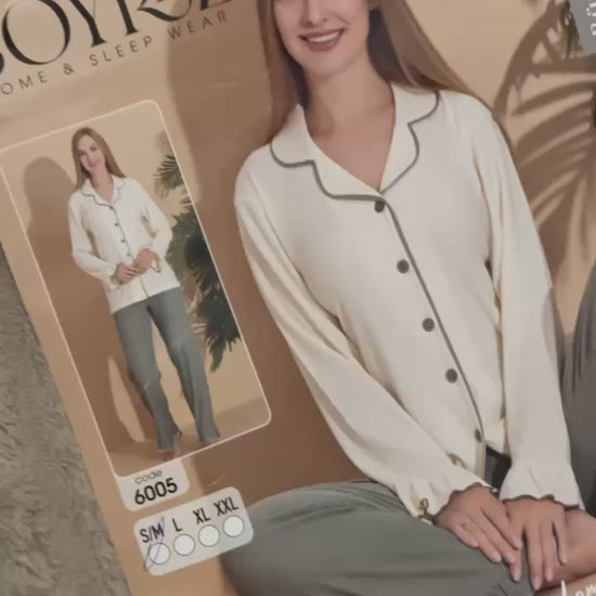 Soft and elegant women’s pajama set in a delicate cream and olive green color combination.