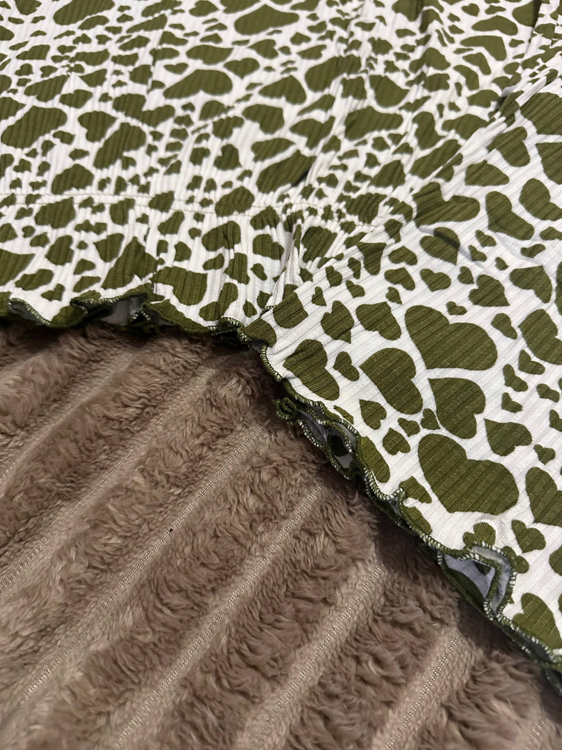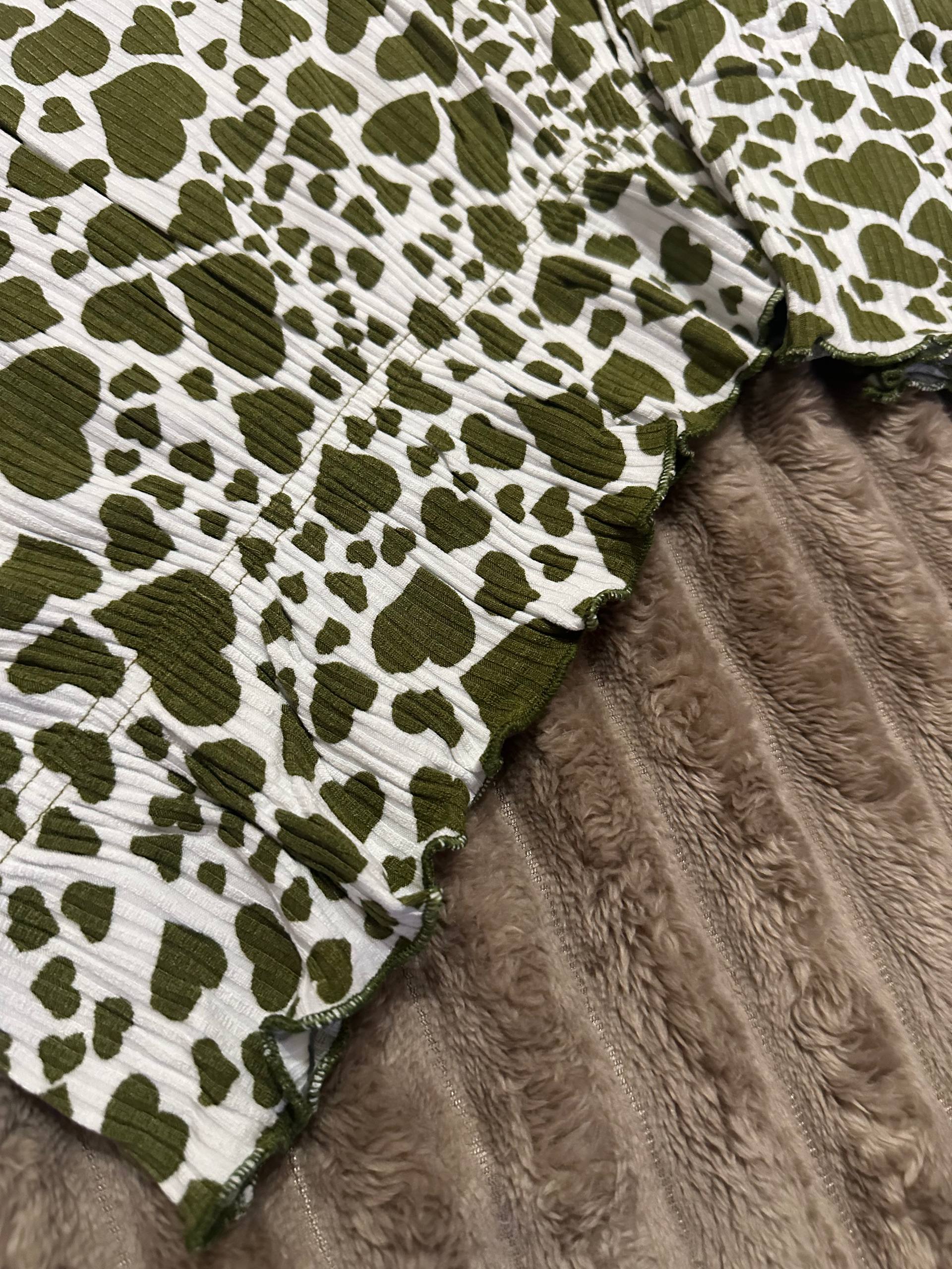 Charming women’s pajama set made of soft ribbed fabric with a cute green heart print.