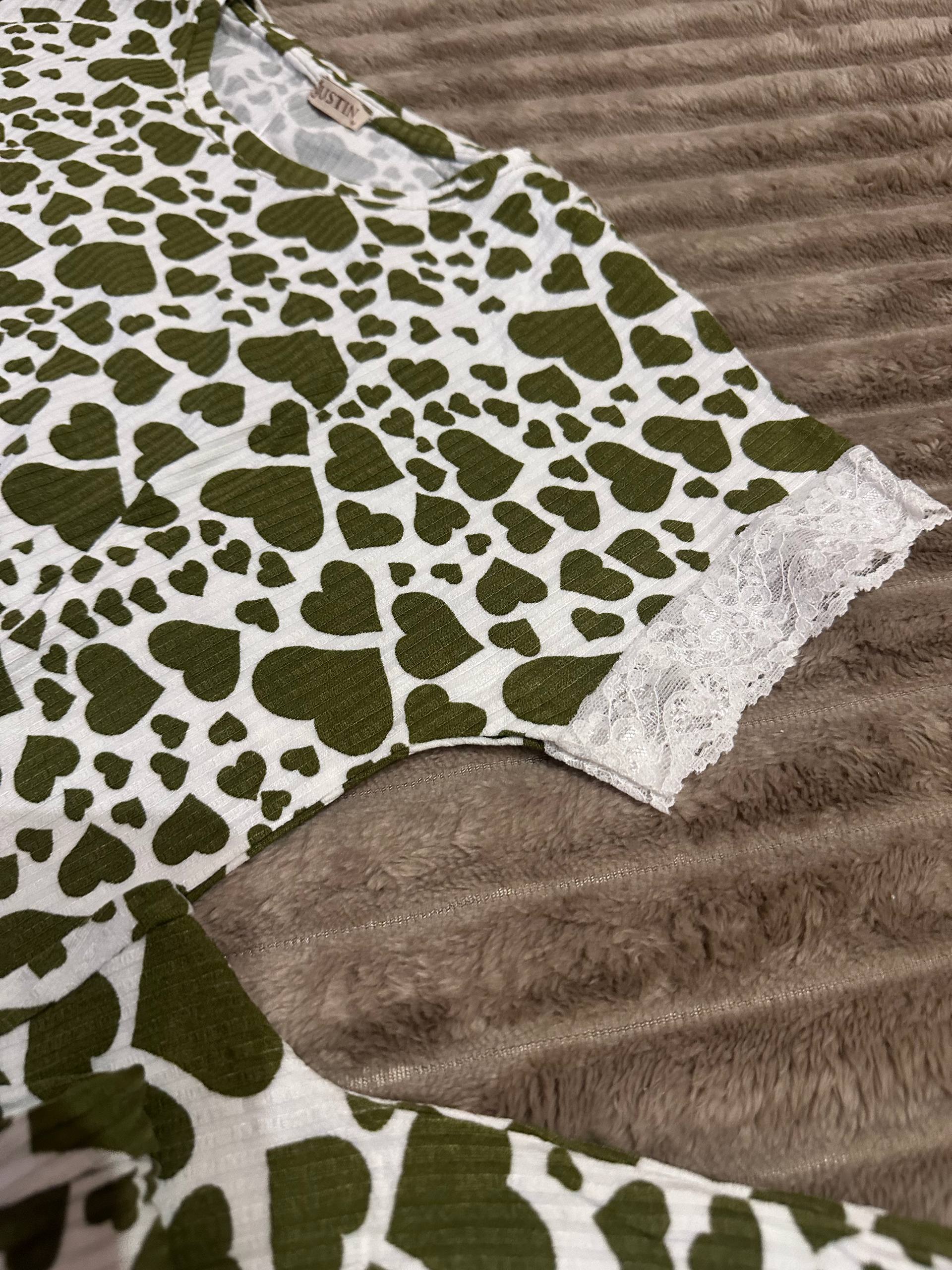 Women’s ribbed pajama set with lace – green hearts print, T-shirt and pants
