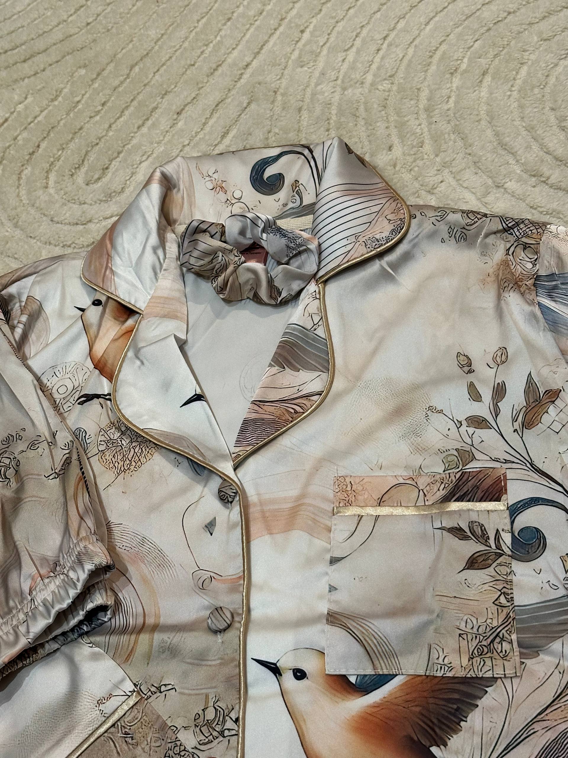 Women’s Satin Pajama Set with Bird Print • Elegant Button Down Sleepwear with Long Pants and Matching Hair Scrunchie