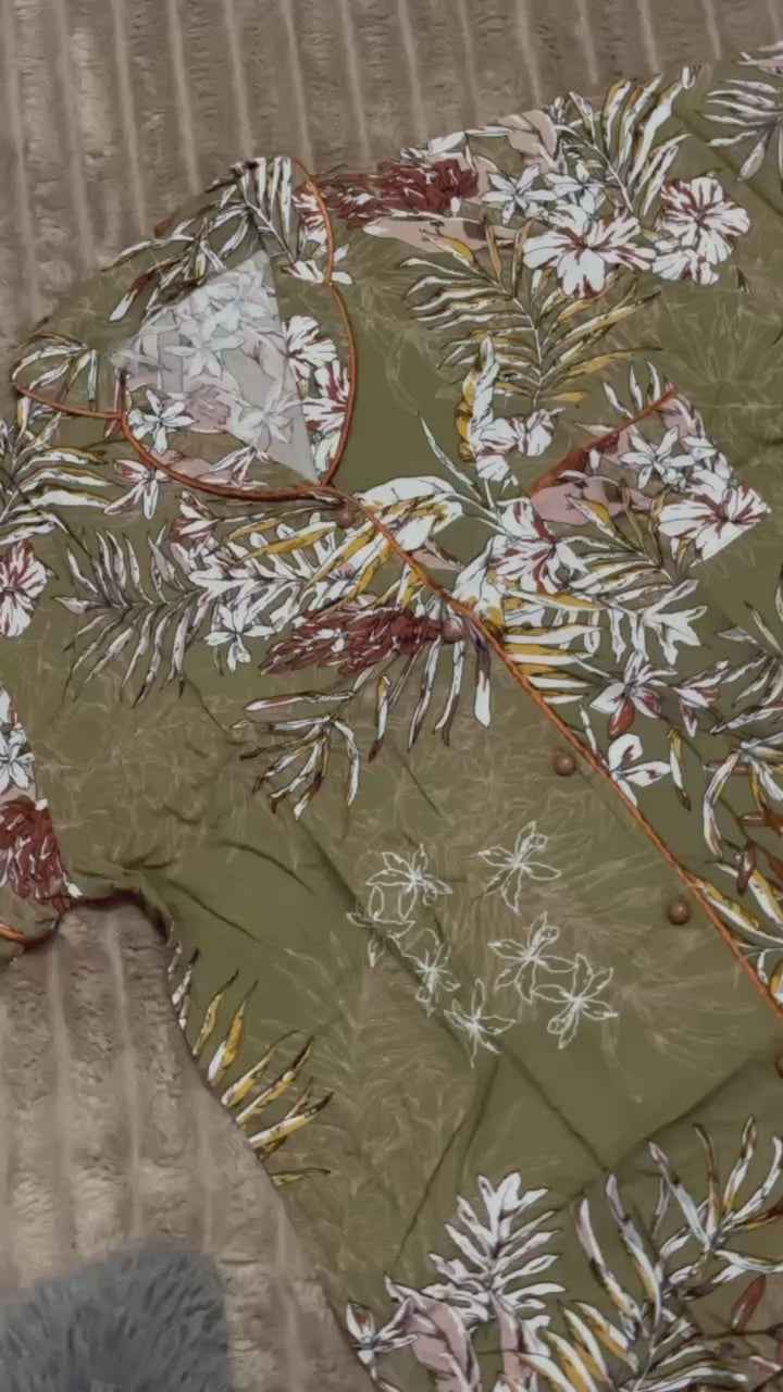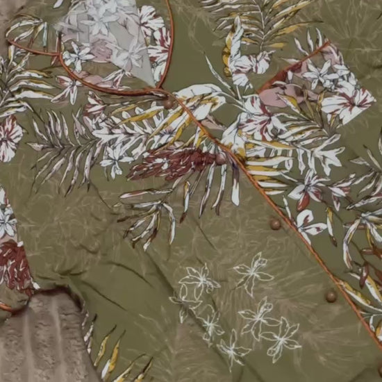 Olive green color with a tropical print for a cozy and stylish look at home.