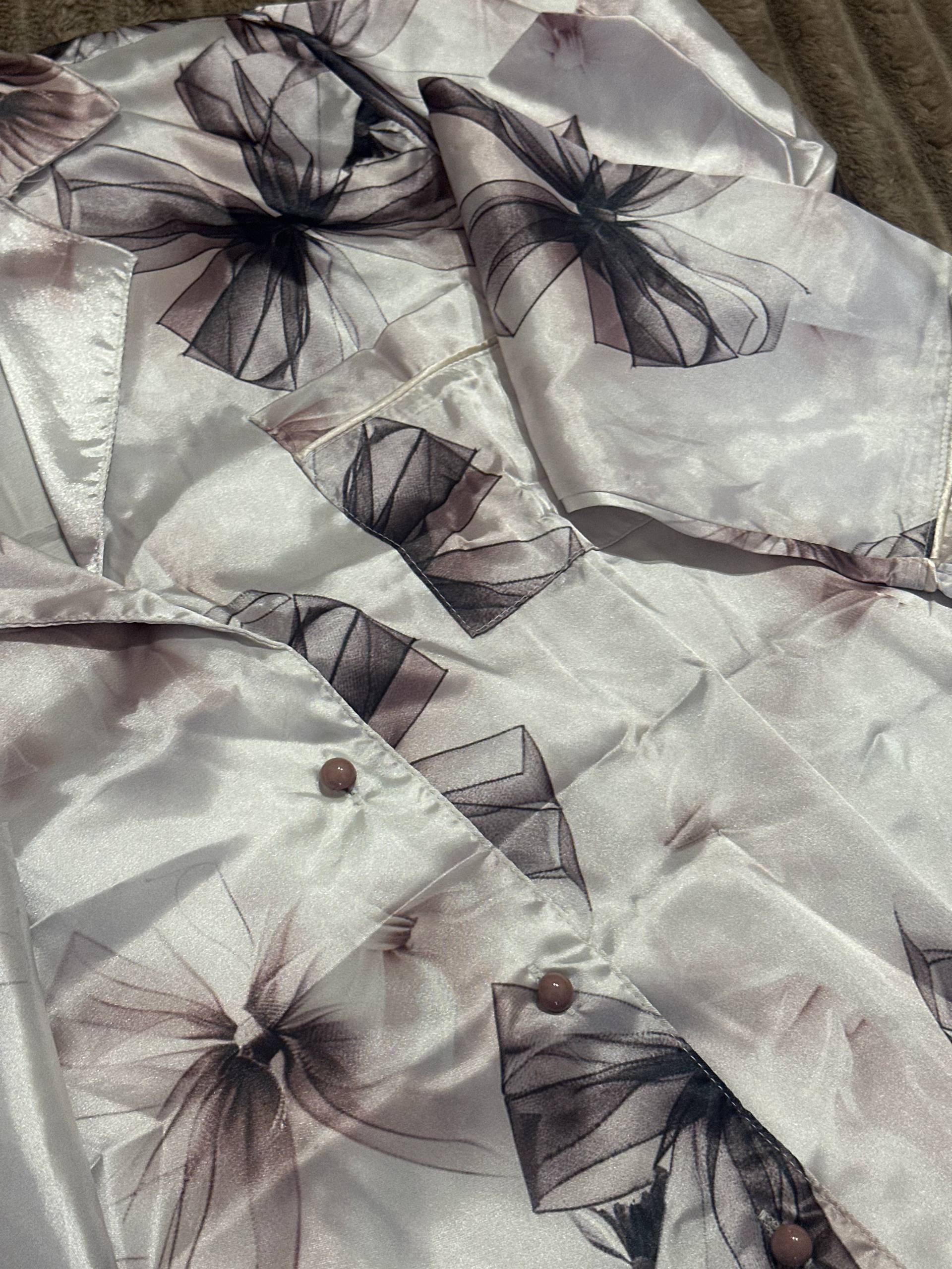 The set includes a long-sleeve button-up shirt and straight pants with an elastic waistband. The soft satin fabric feels cool and smooth on the skin, making it perfect for both sleeping and lounging. The delicate bow print adds a touch of femininity and elegance.